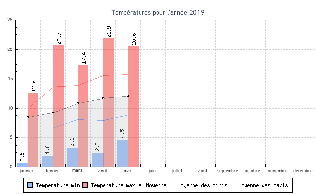 | Mois | Températures min | Températures max | Moyenne mensuelle |