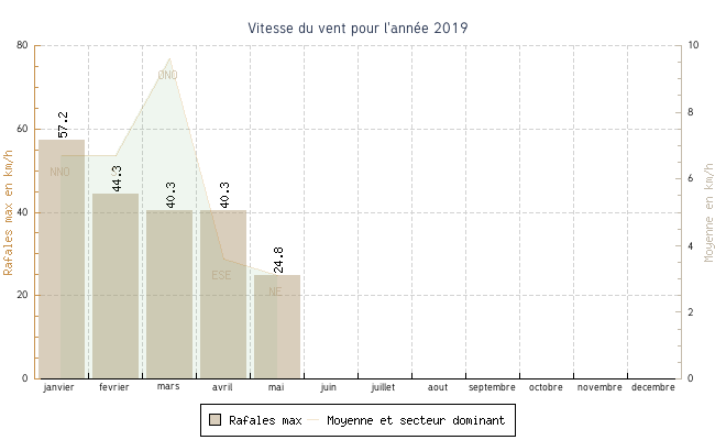 | janvier | 0.6 °C | 6.7 °C | 12.6 °C | 10.0 °C | 8.4 °C | 6.7 km/h | 57.2 km/h | NNO |
